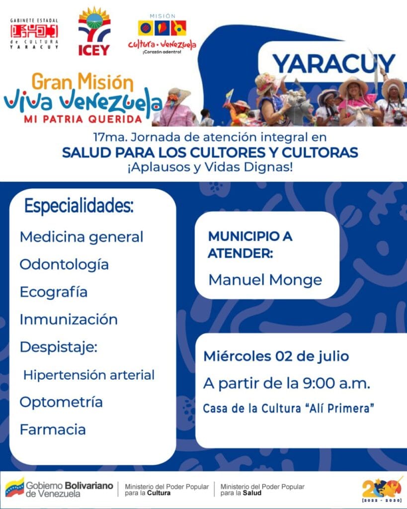 Este miércoles 2 de julio, a partir de las 9:00 a. m., se llevará a cabo la 17ª Jornada de Atención Médica Integral para cultores y cultoras en la Casa de la Cultura “Alí Primera” de Yumare, municipio Manuel Monge del estado Yaracuy. Esta actividad forma parte del despliegue nacional de la Gran Misión Viva Venezuela Mi Patria Querida.