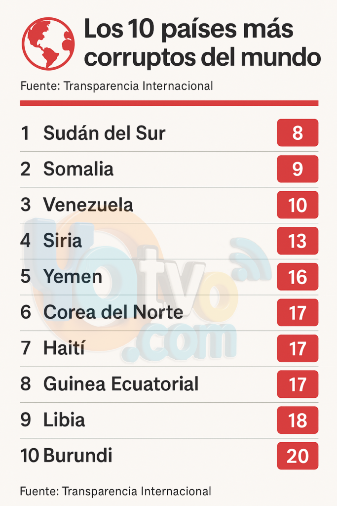 Por segundo año consecutivo, Venezuela figura entre las naciones con peor desempeño en el Índice de Percepción de la Corrupción (IPC), elaborado por Transparencia Internacional (TI). En el informe correspondiente a 2025, el país se ubicó en la posición 180 de 182 países evaluados, con una puntuación de apenas 10 sobre 100, solo por encima de Somalia y Sudán del Sur, que obtuvieron 9 puntos cada uno.
