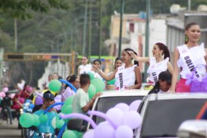 El grupo de hermosas jóvenes que optan por la corona en esta edición Nro. 68 de las ferias más antiguas del país, integrado por Andreismar Bacalau (Arístides Bastidas), Roimelys Medina (Bolívar), Erika Martínez (Bruzual), Edismelys Yépez (Cocorote), Emily Mariani (Independencia), Victoria Bastidas (José Antonio Páez), Liliana Ramos (La Trinidad), Fransheska Rodríguez (Manuel Monge), Seleangellys Ojeda (Nirgua), Cinthya Caldera (Peña), Zobeida Jiménez (San Felipe), Yenimar Yépez (Sucre), Jhoscarly Garay (Urachiche) y Orliannys Serrano (Veroes), durante el trayecto lucieron su mejor sonrisa, desbordando simpatía y dulzura regalando a su paso gran cantidad de caramelos.